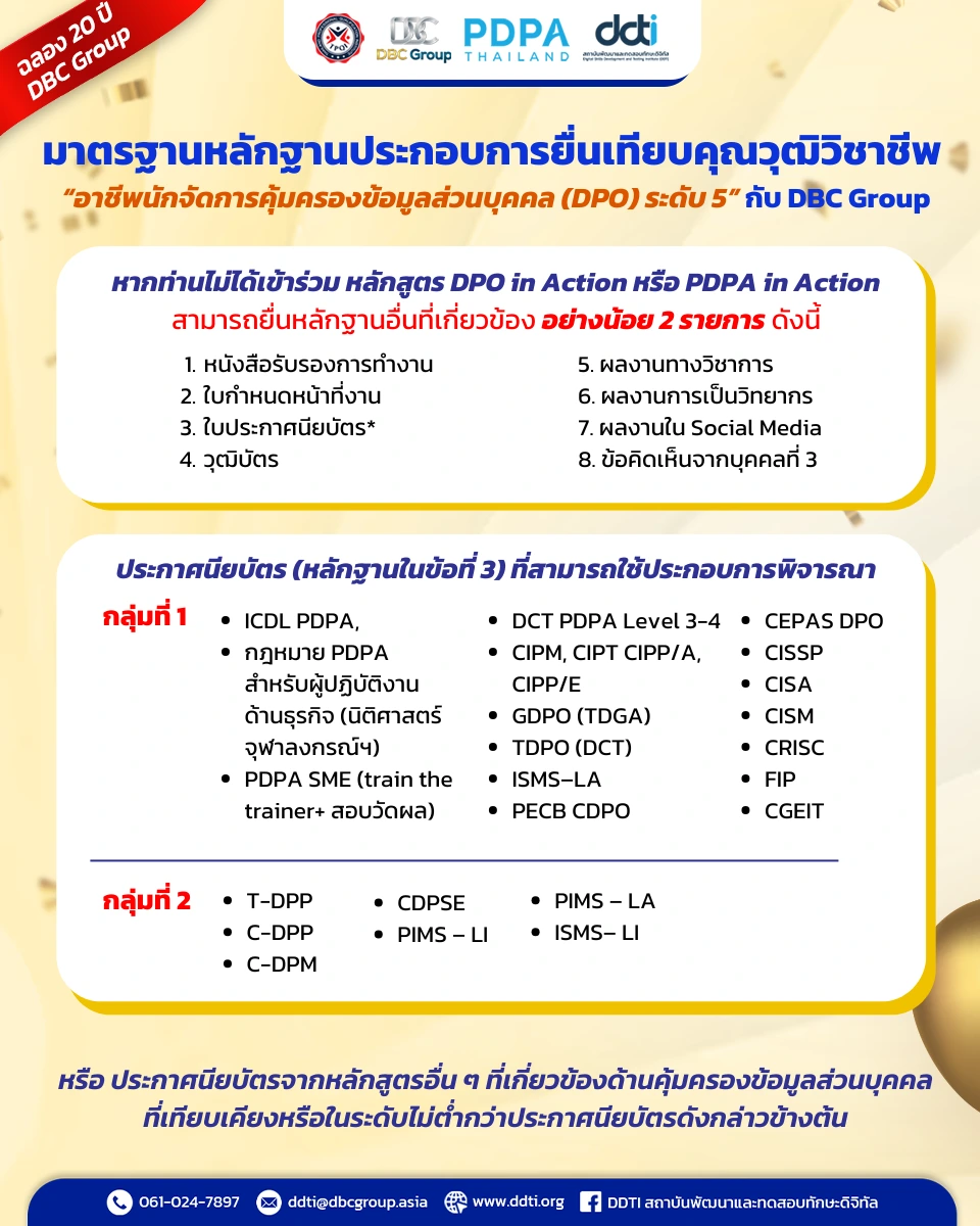 ศึกษาเพิ่มเติมที่ >> https://tpqi-net.tpqi.go.th/qualifications/4344 - DPO ระดับ 6 สำหรับผู้ปฏิบัติหน้าที่เป็นหัวหน้าคณะทำงาน หรือ DPO ขององค์กร