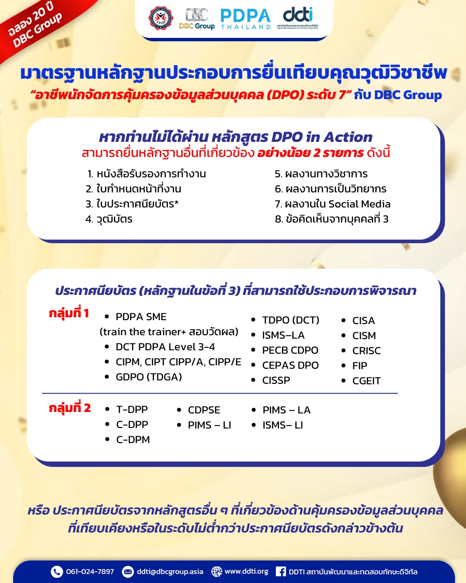 ศึกษาเพิ่มเติมที่ >> https://tpqi-net.tpqi.go.th/qualifications/4345 - DPO ระดับ 7 สำหรับผู้เชี่ยวชาญด้านการคุ้มครองข้อมูลส่วนบุคคล และสามารถให้คำแนะนำกับผู้อื่นหรือองค์กรได้ดี
